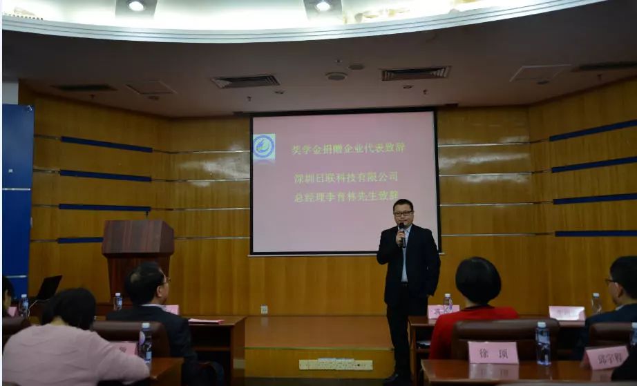 奖学金颁奖仪式由屈军乐院长主持,学院领导宣读了2017年度“刘骏奖学金”的20名获奖名单,其中一等奖5名,二等奖15名;奖学金设立人刘骏先生因在外地出差,特委托日联科技深圳公司总经理李育林先生代为颁发。李育林先生首先向获奖同学转达董事长刘骏先生的祝贺,同时鼓励学生们在后续学习中百尺竿头更进一步,努力成为国家栋梁之才。并借用日联科技“阳光、正派、学习、感恩”的企业精神与在座的各位学子共勉,也欢迎各位毕业生到日联科技就业深造。